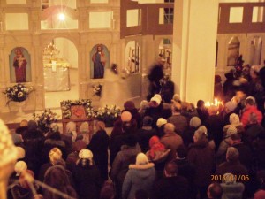 6 января в 22.00 прихожане храма в честь Вознесения Господня собрались вместе на праздничном Рождественском Богослужении в верхнем ярусе храма, где ещё только возводится иконостас. Великое повечерие, утреню, и Божественная Литургию совершил настоятель храма протоиерей Владимир Пинько. Сослужил настоятелю иерей Сергий Леонов. Настоятель обратился к прихожанам с праздничной речью и зачитал Рождественское обращение к пастве Святейшего Патриарха Московского Кирилла. По окончании Богослужения прихожане были приглашены в нижний ярус храма на праздничный фуршет.