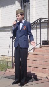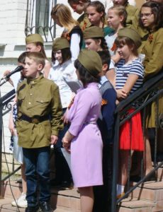 Звуки музыки и прекрасная погода создавали атмосферу радостного праздника. Ребята исполнили песни об ушедшей войне, разученные в классе хорового пения Лякишевой Екатерины Александровны.